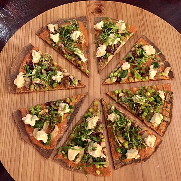 使用無麩質生披薩餅皮,就必須用核桃等食材在45度以下風乾製作24小時才得以製成。