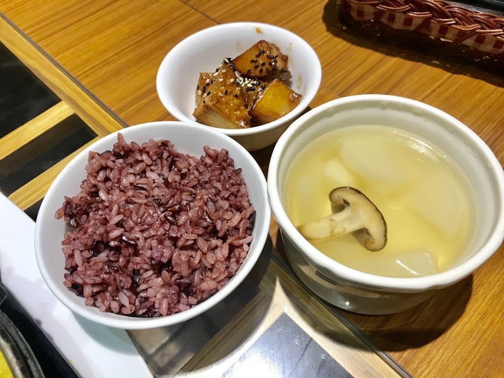 一道小菜和紫米飯~湯品的部分是可續碗!