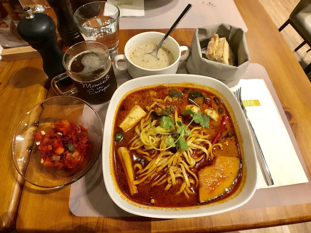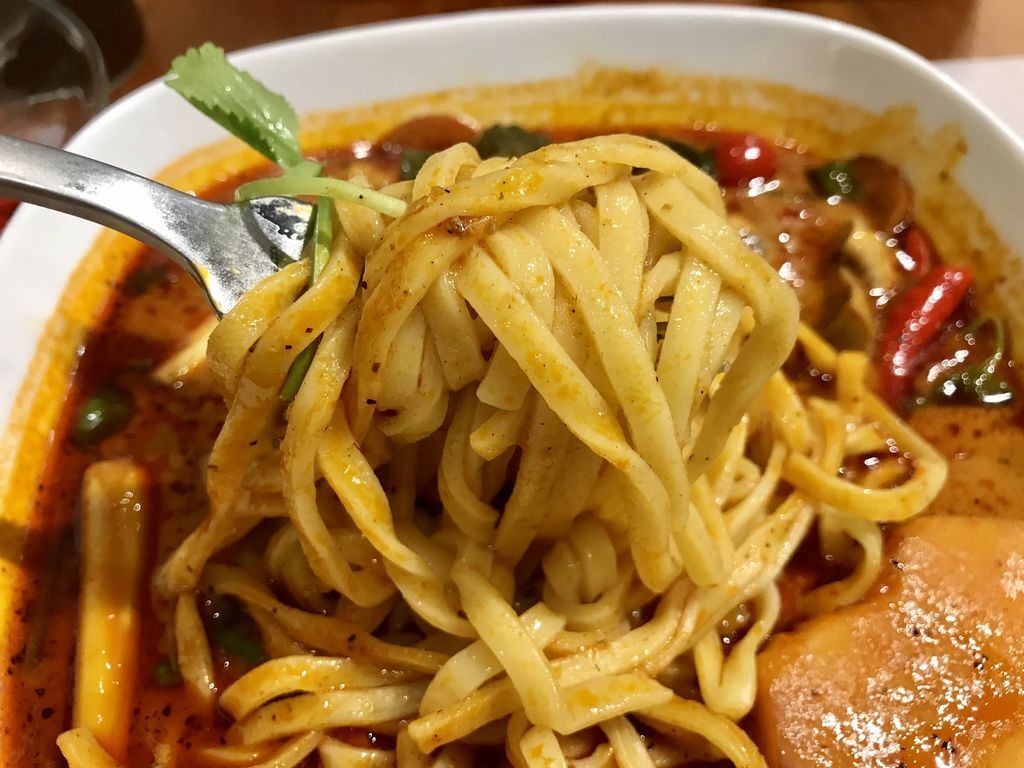 我的主餐出現啦,南洋風酸辣湯麵(手工扁麵),超大碗ㄟ!