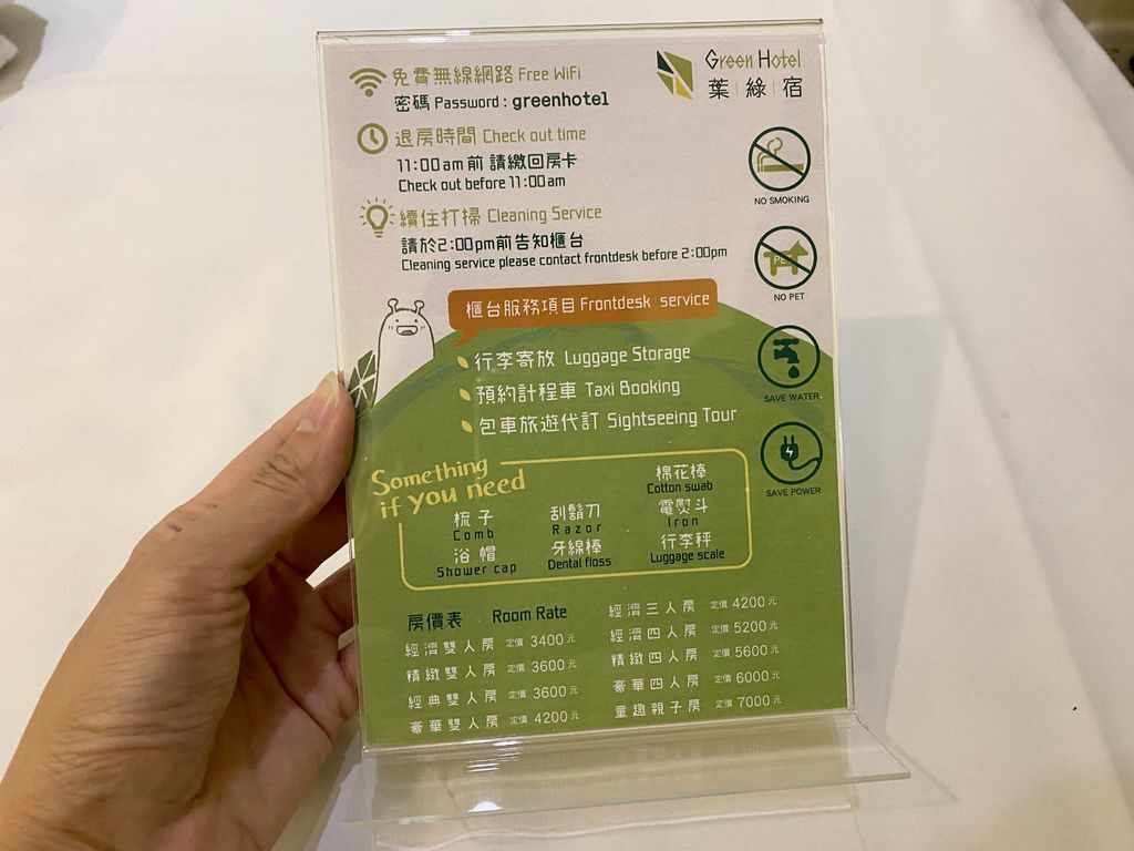 葉綠宿提供的服務有行李寄放 、預約計程車或包車旅遊代訂~