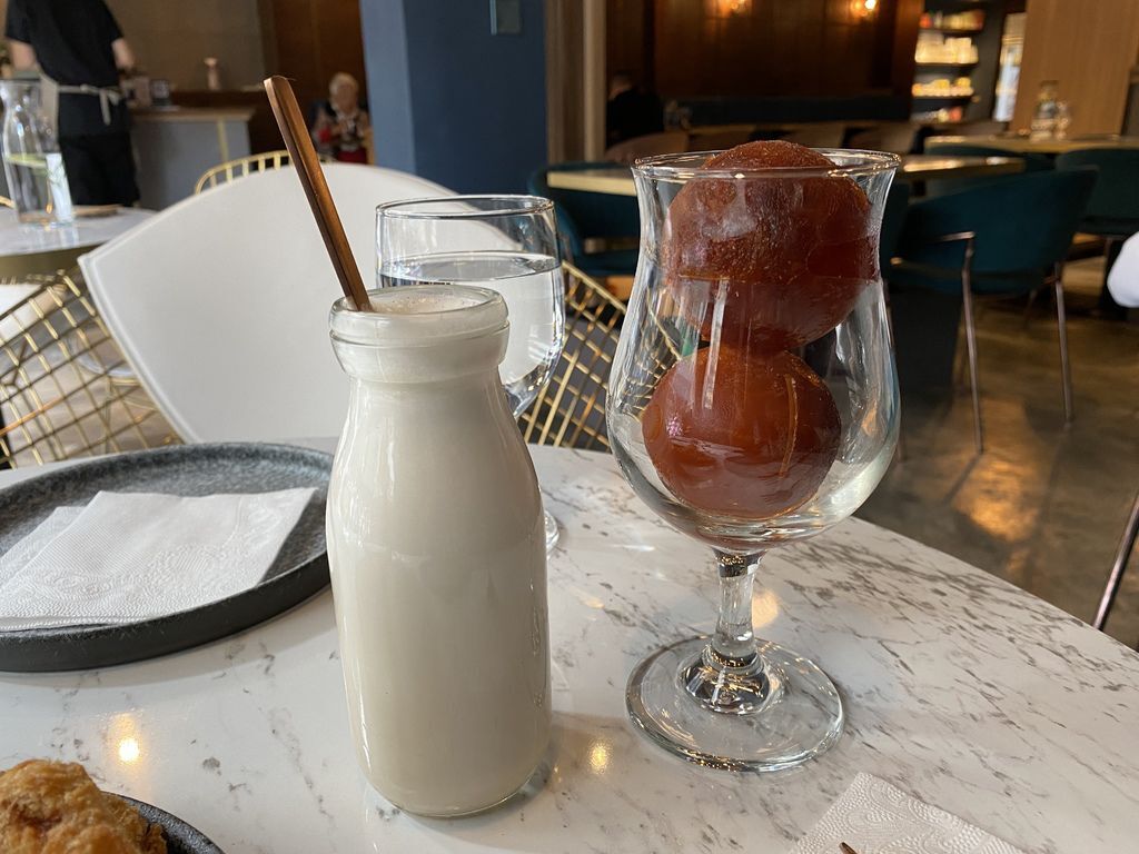 它有一杯兩大球的茶冰磚,附上一杯熱的杏仁堅果飲,直接淋上去就可以喝了,過程還可以看到泰式奶茶混搭的顏色很夢幻