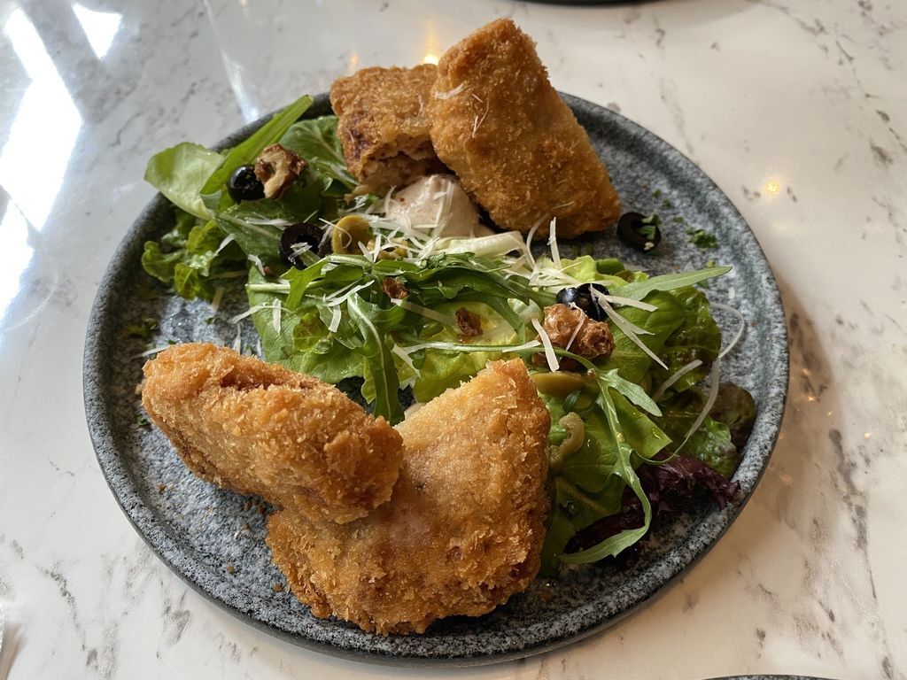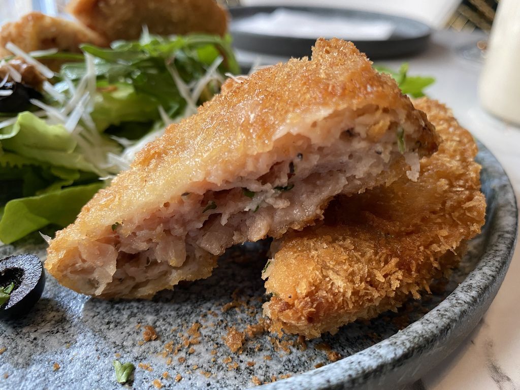 開胃菜「B-2」有炸肉餅、塔塔醬、芝麻葉、核桃,價位是$220元