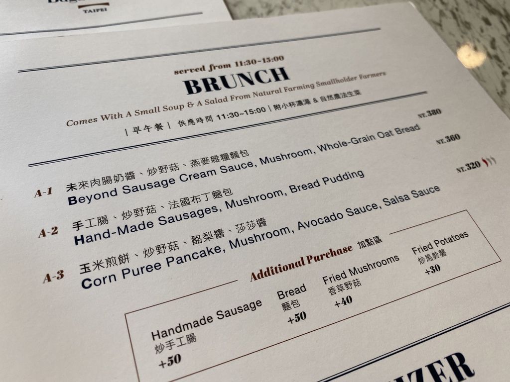 「A-2」早午餐有手工腸 、炒野菇 、法國布丁麵包,另有附上小杯濃湯及自然農法生菜