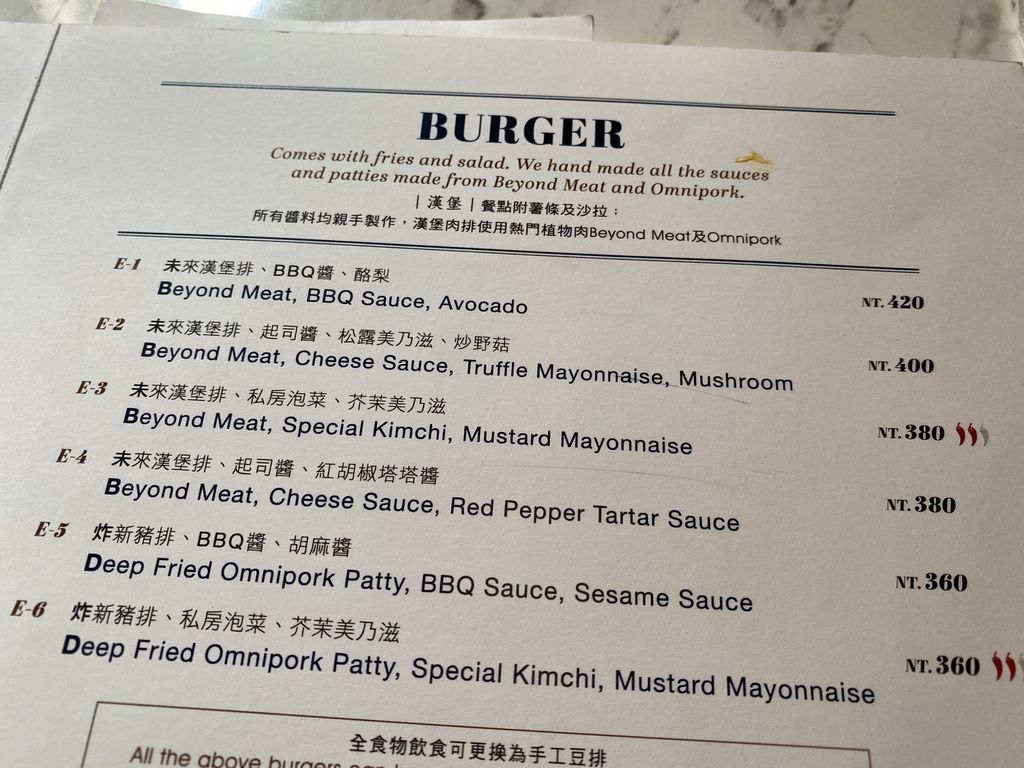 「E-2」的漢堡有未來漢堡排、起司醬、松露美乃滋、炒野菇,另有附沙拉和薯條,這價位是$400元