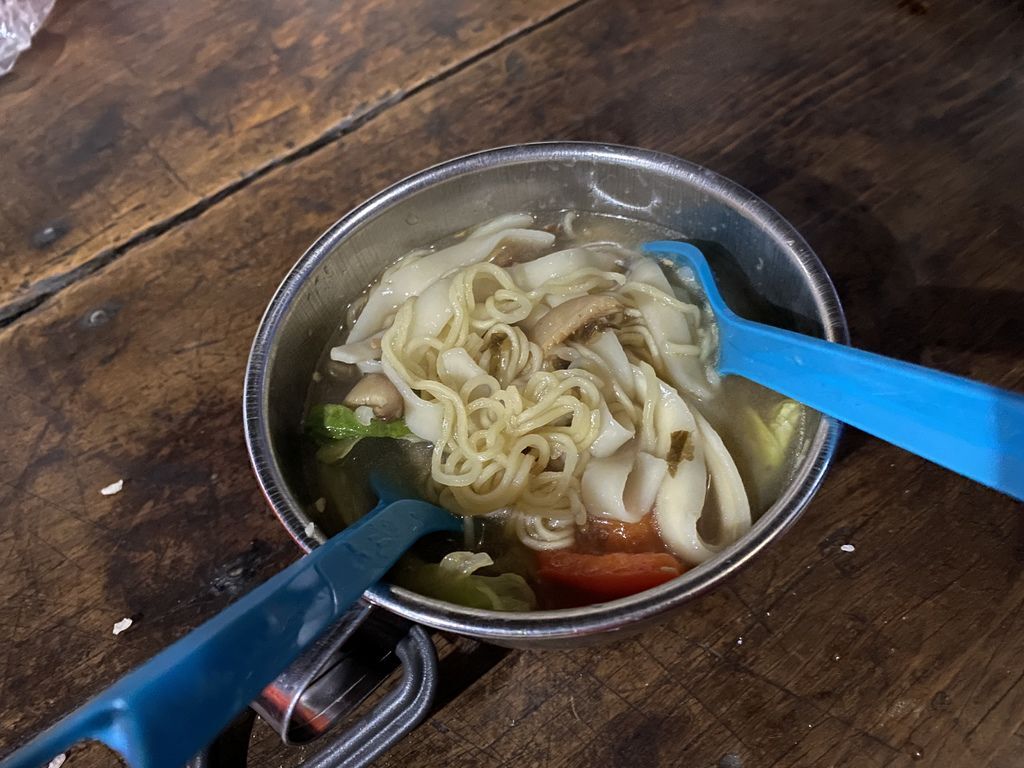 晚上我煮了素食當歸泡麵,自己覺得耐放的青菜有青江菜和玉米筍,早上揹上來到現在都不成問題,爬山可以吃到蔬菜真的好幸福。