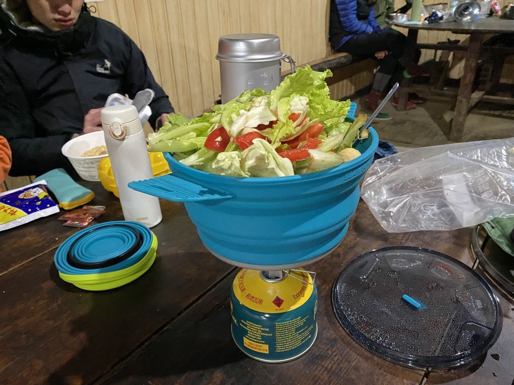 同行的友人有準備鍋具和食材,滿滿的蔬菜真的超幸福,如果是第一次登山的朋友,高山爐和爐頭 、鍋具這些都要自己揹上來喔!