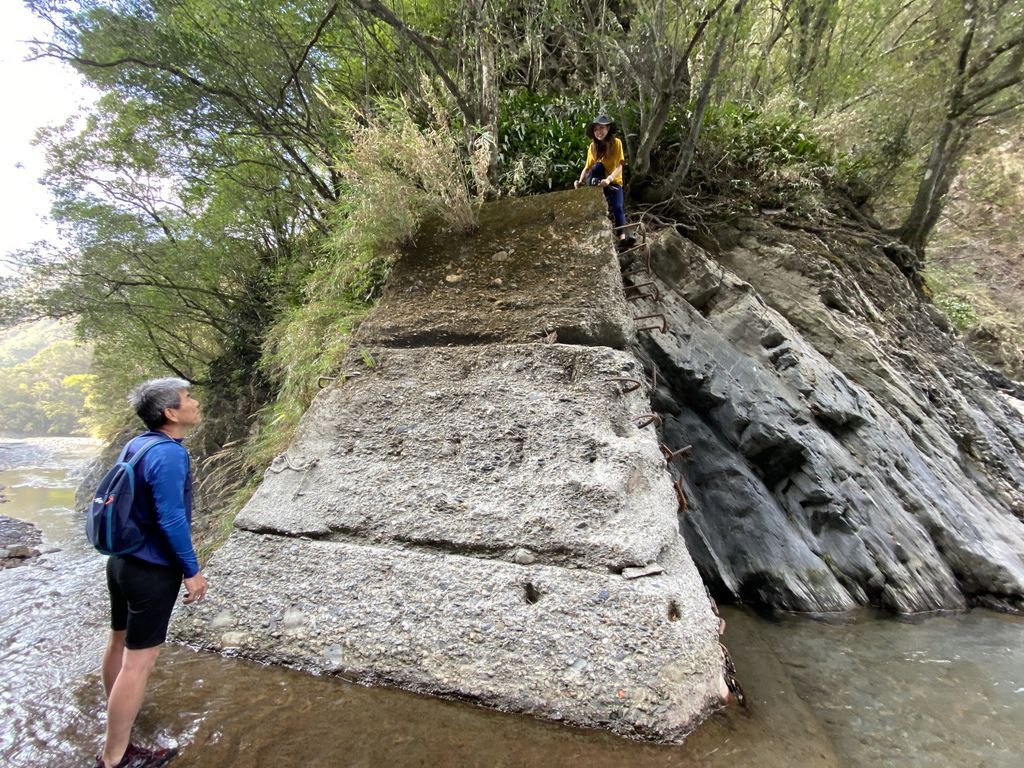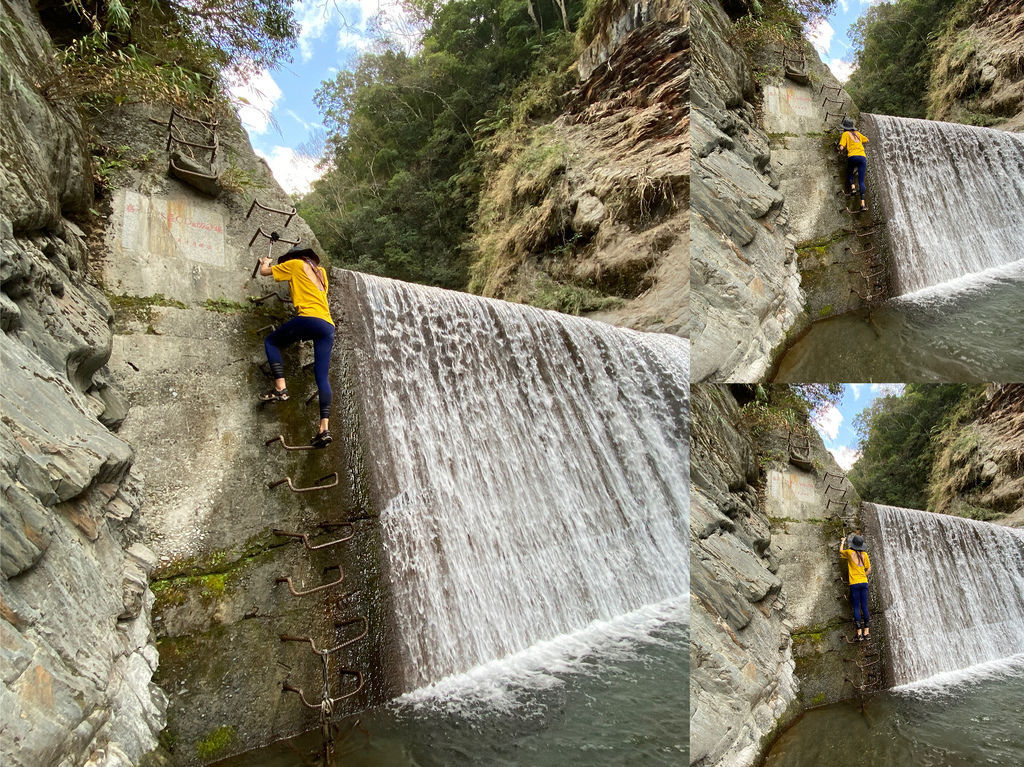 要攀爬這鐵梯才能越過第三座的攔砂壩喔!