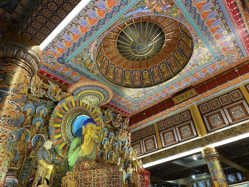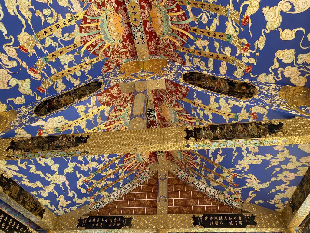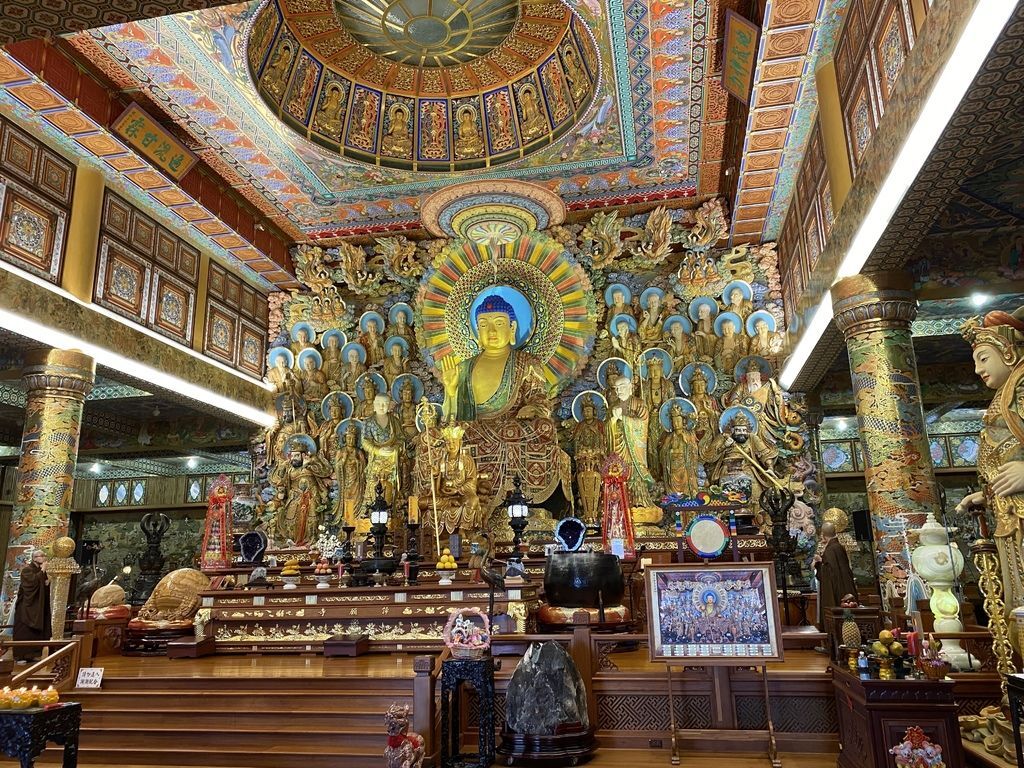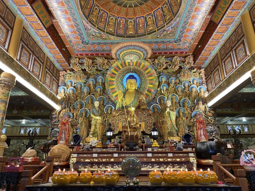 值得一提的是大雄寶殿內的浮雕壁畫是彙集了中國大陸、日本、韓國及在地的工藝大師,運用各地不同色彩的青田玉石精心鑲製而成。