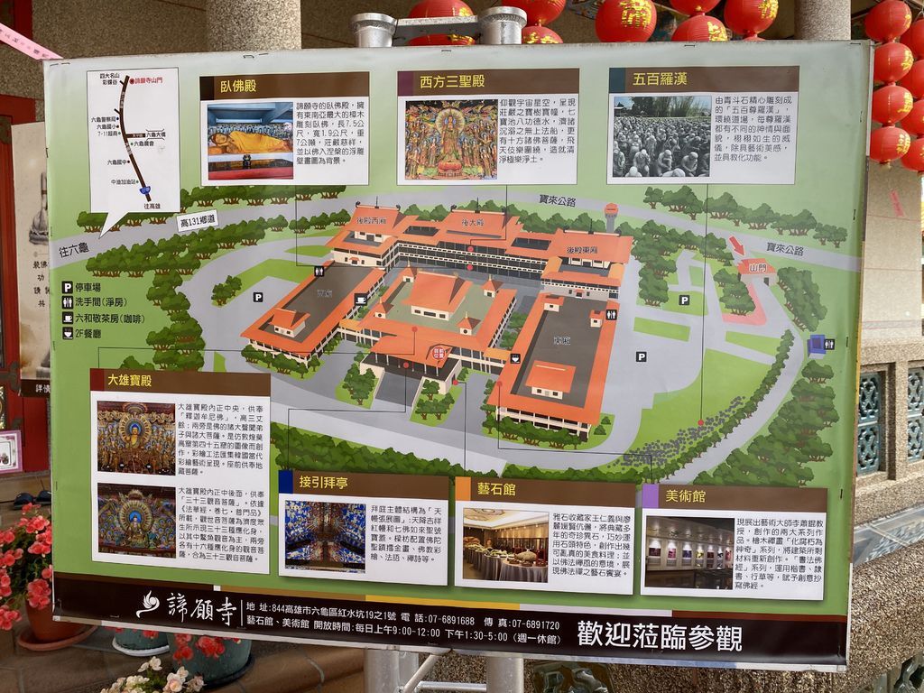 諦願寺大殿供奉的為釋迦牟尼佛及地藏王菩薩,有著大型宮殿式寺院建築,兼具傳統與創新的風格,大雄寶殿內的浮雕壁畫彙集了中國大陸、日本、韓國及在地的工藝大師,運用各地不同色彩的青田玉石精心鑲製而成,另外在臥佛殿則擁有東南亞最大的樟木雕刻臥佛像,在廟外還有由青斗石精心雕刻的五百尊羅漢,樣貌生動十分壯觀!藝石館及美術館不定時也展出居士及教授的珍藏愛作,喜歡宗教藝術的朋友千萬不要錯過這個不一樣的六龜景點。