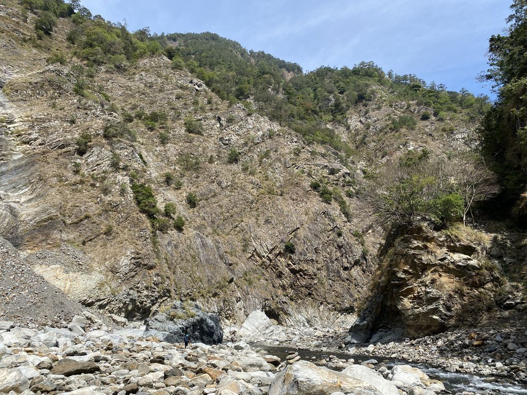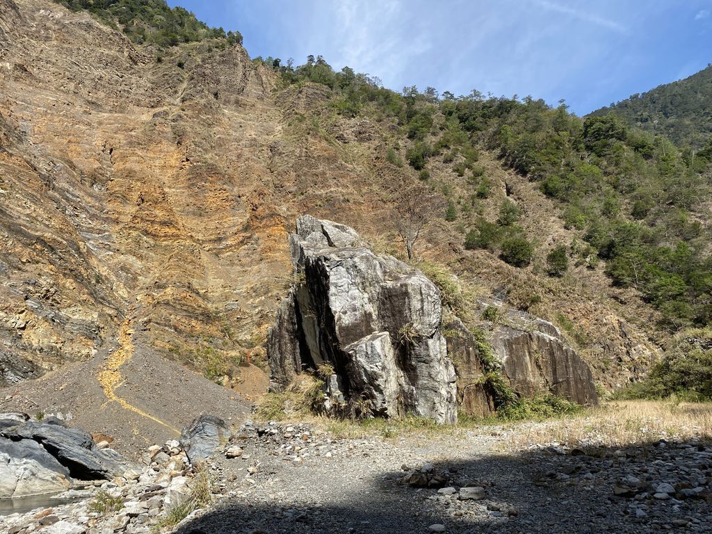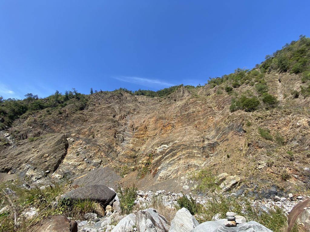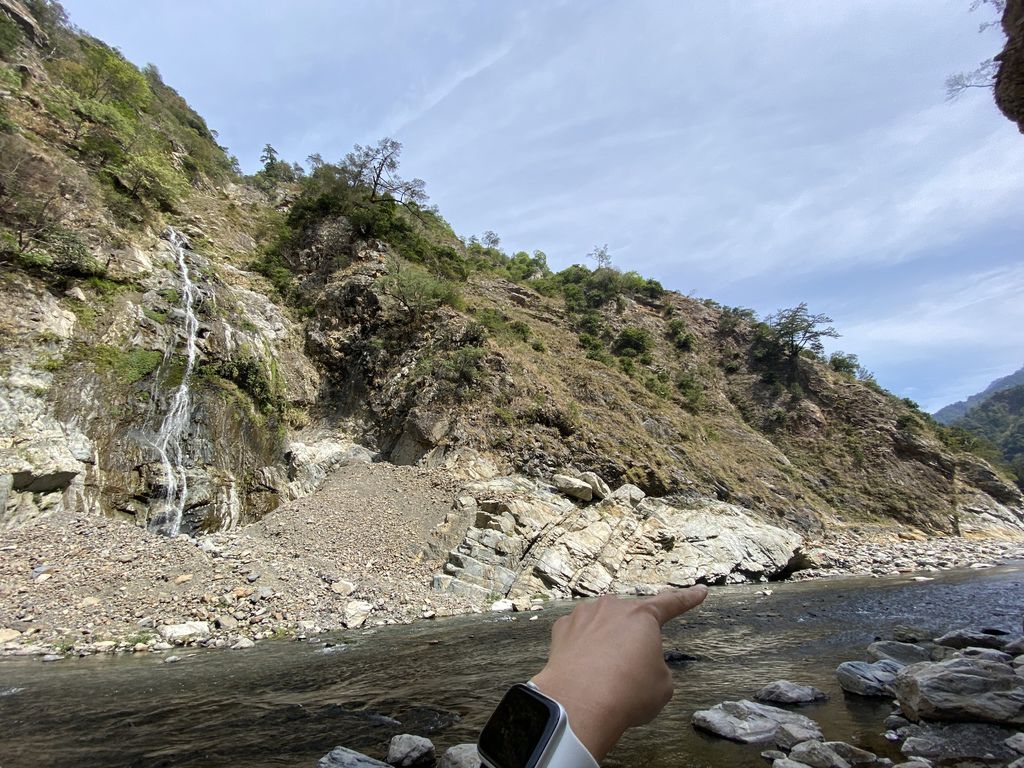 原因是在一開始去程的路段我們便直接往溪谷底走去,沒發現其實在上坡一點的碎石芒草路段有路徑,所以在溪谷來來回回的S型過溪,使得在時間及距離上都增加了許多~這部分也提供給大家做參考喔!