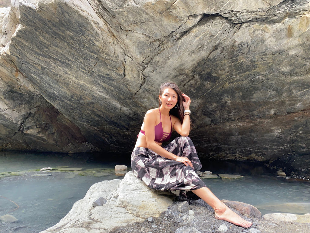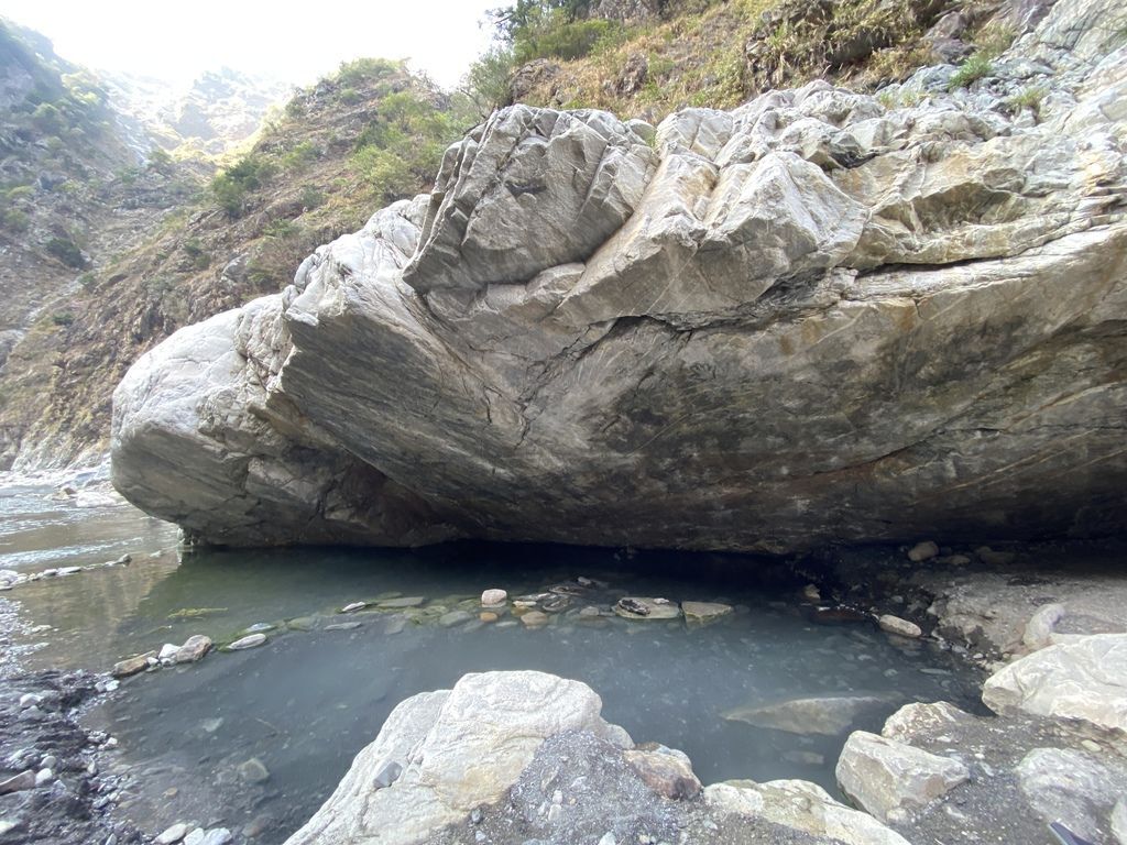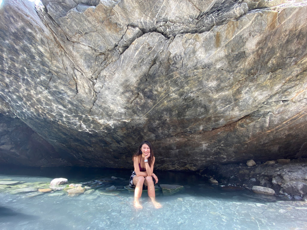 岩石底下藏著一處溫泉,成了大自然最佳的遮陽遮雨屏障!就像是保護傘一般,實在很驚喜!