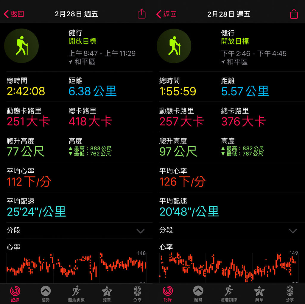 最後附上小羽去回程的Apple watch series5體能紀錄給大家~去程和回程的時間其實是一樣的路段,但為甚麼總時間會差了近一個小時呢?