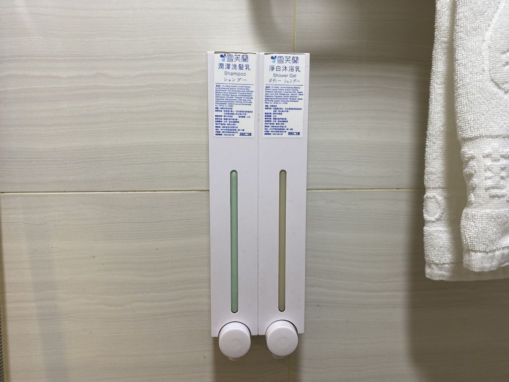 牆上有提供雪芙蘭洗髮乳及沐浴乳