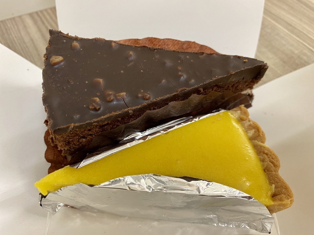 下圖的上為金莎榛果巧克力$35元,下為蜂蜜檸檬生乳乳酪塔$30元