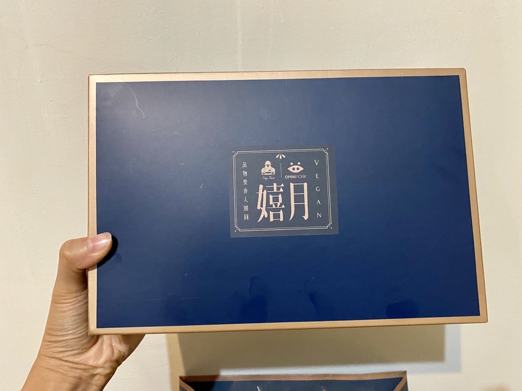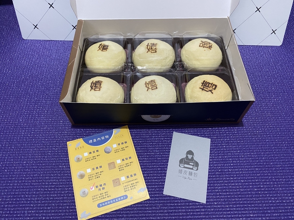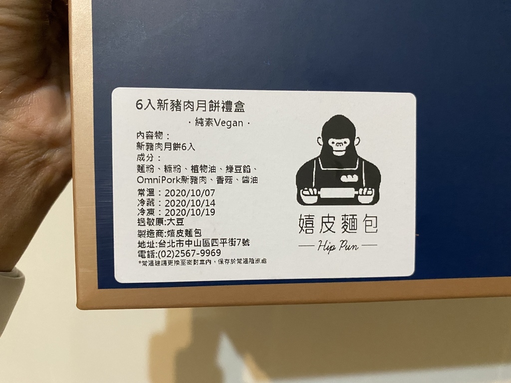 上面寫著「嬉月」兩個字~另外這個中秋禮盒是HIP PUN嬉皮麵包和OmniPonk新豬肉聯名出的純素月餅喔!