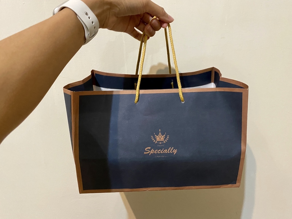 收到這樣靛藍色紙袋裝的中秋月餅禮盒,看起來像是禮品,很有質感!