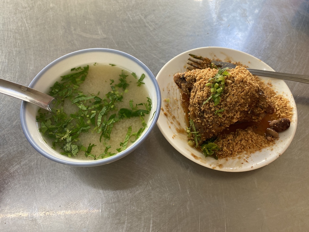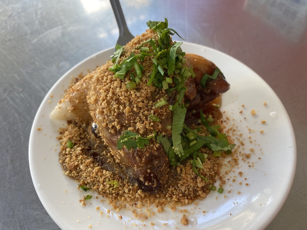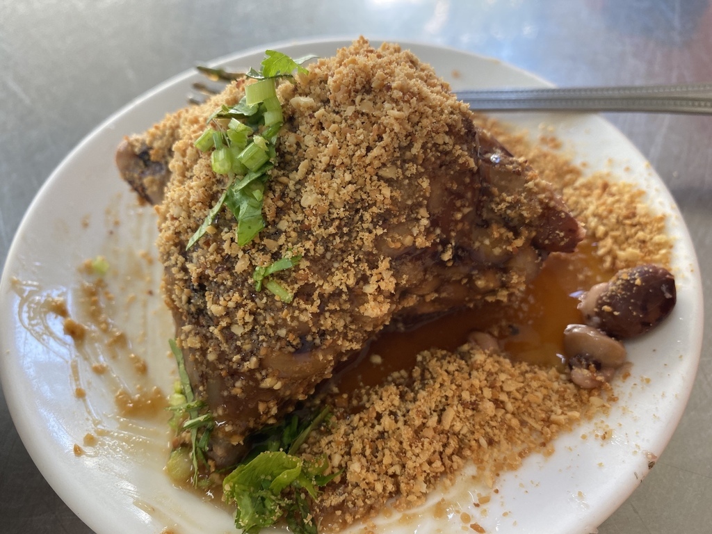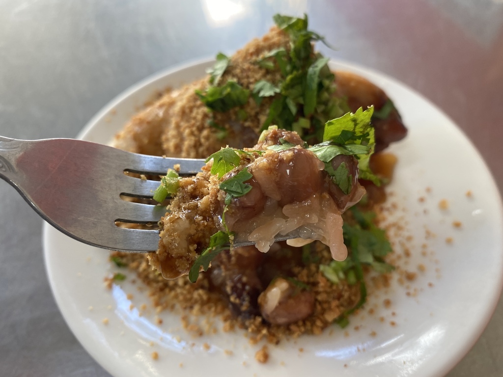 撒上滿滿的花生粉,及放上香菜作點綴提味,這樣的傳統古早味吃法讓我想到了台灣著名小吃米血糕