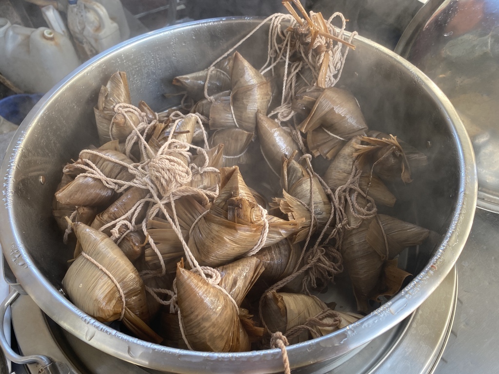 熱呼呼的菜粽是用蒸籠蒸熟的,粽葉是使用南部粽常用的麻竹葉,優點是若水煮會比較耐煮
