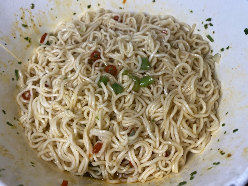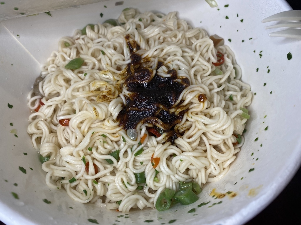 一般這樣的即時拌麵僅會附簡單的調味醬包,不會另外附蔬菜包,然而這新品的設計是另附一包蔬菜包,需要和麵體一起沖泡熱水才能泡開食用喔!