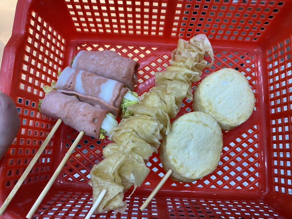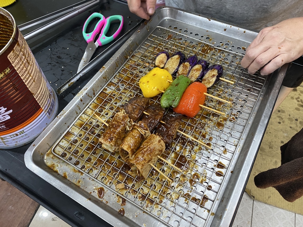 這次拿的以蔬菜為主,就沒有拿素肉的選項了,下圖左至右分別是豆皮夾高麗菜串$40元、香菇串$30元、紅黃青椒串$30元、茄子串$30元