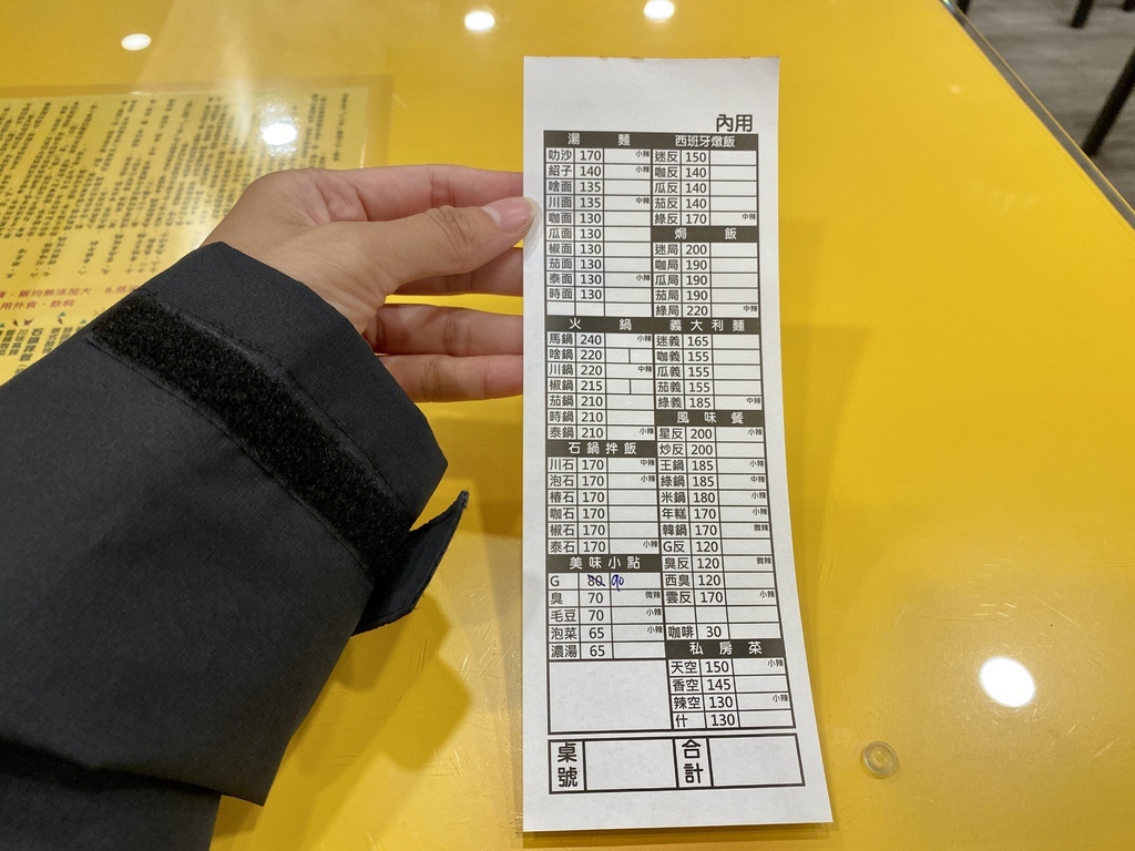 比較有趣的是桌上菜單下方的括號為菜色簡稱,座位上的紙本菜單僅有簡稱選項,點菜時還一度會摸不著頭緒!