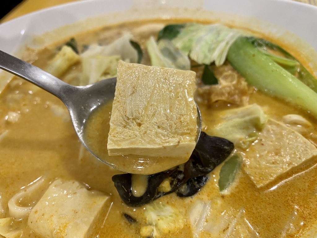 麵體統一提供這樣的寬麵,蔬菜的部份給的算是大方,有高麗菜、青江菜、秀珍菇、黑木耳、番茄、豆皮、玉米筍及有機咖哩葉,