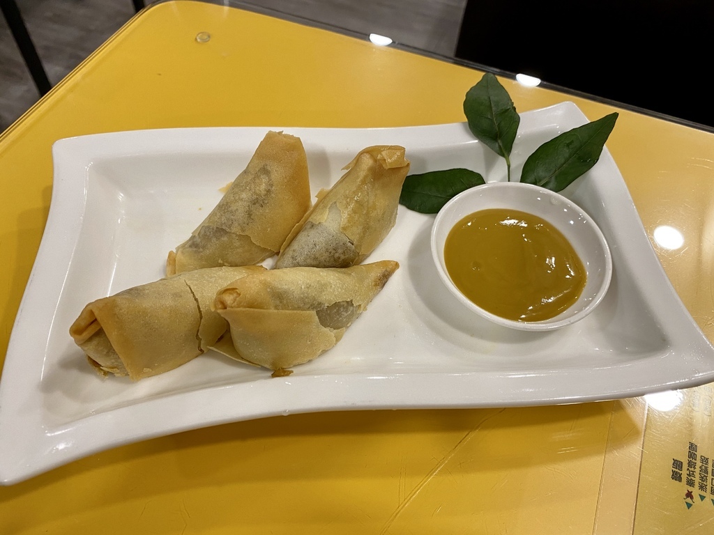 而咖哩餃外層的口感酥脆,吃起來是炸春捲皮,反而不是炸餃皮的搭配,這點也是較不一樣的吃法!