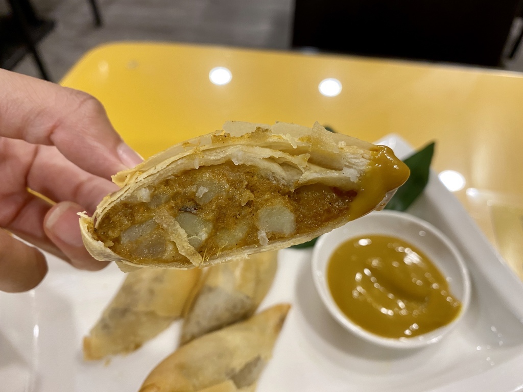 咖哩餃的橫切面是這樣的,有著滿滿的咖哩及馬鈴薯泥,吃起來扎實、很有飽足感!