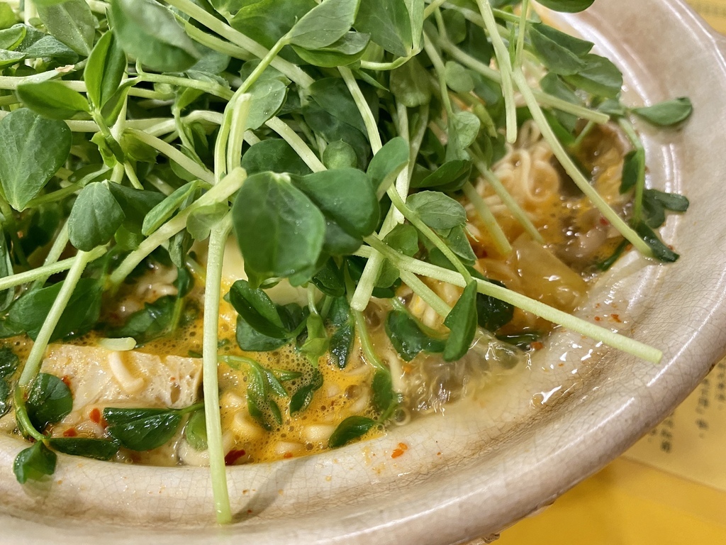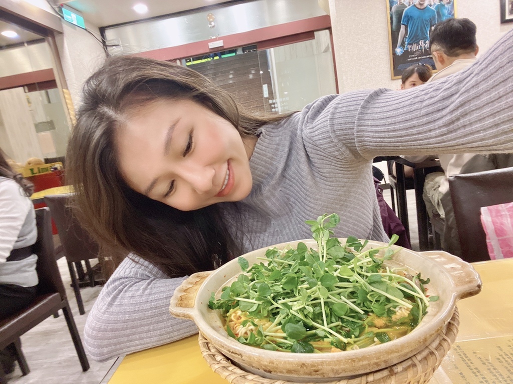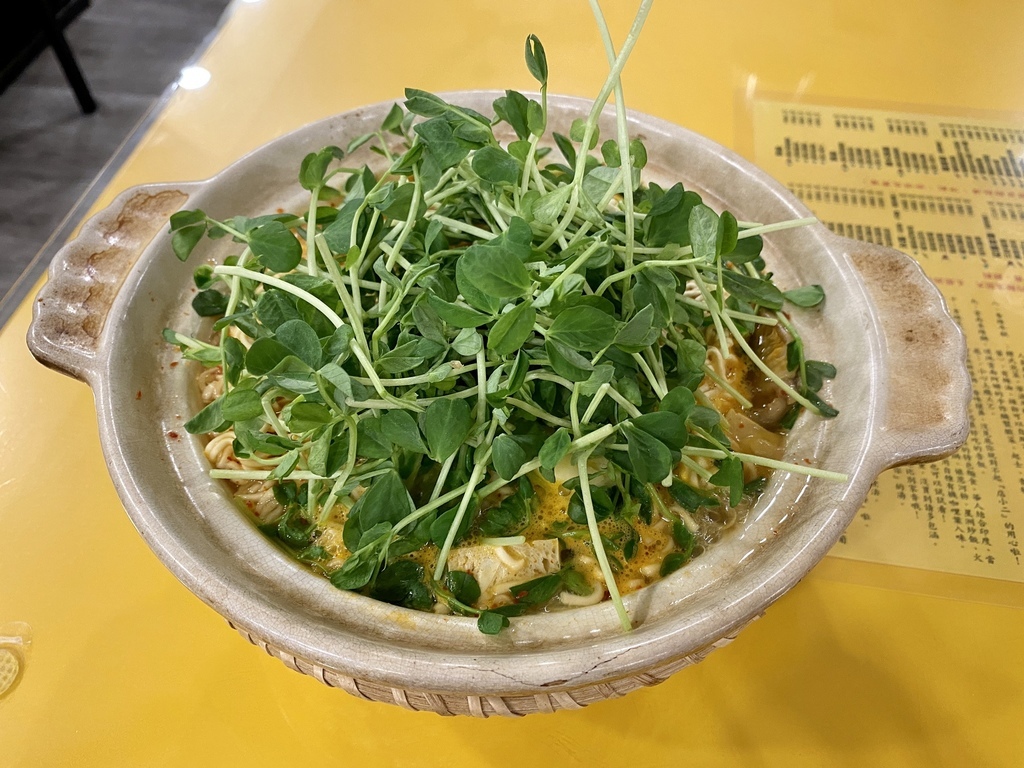 是用這樣的陶鍋容器,吸睛的是上面還放了好多豌豆苗,看起來真的快要滿出來啦!