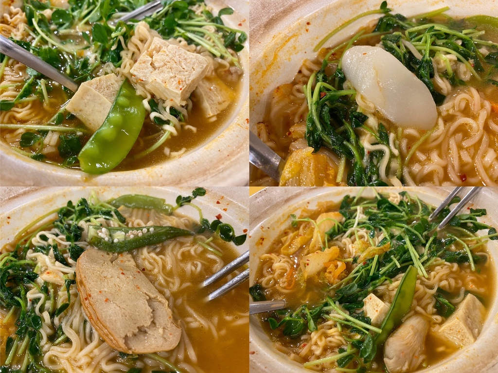 裡面主食是王子麵,另有起司、四季豆、秀珍菇、秋葵、凍豆腐、泡菜、素肉片及年糕,湯頭部分也很夠味,是道美味的韓式料理!