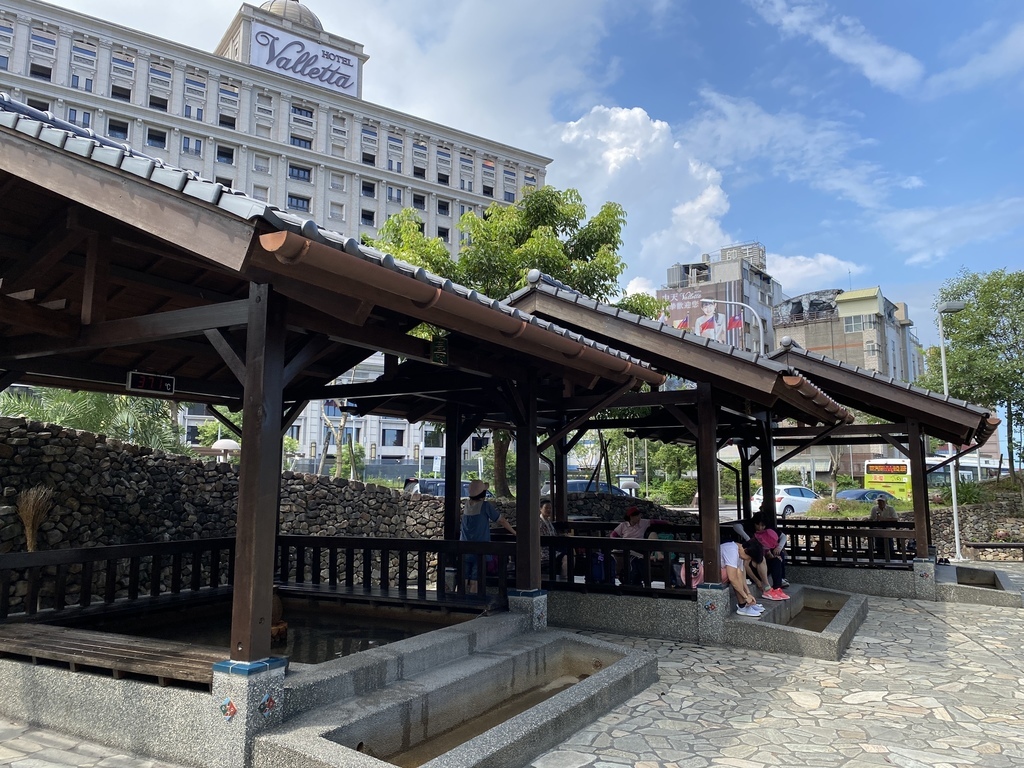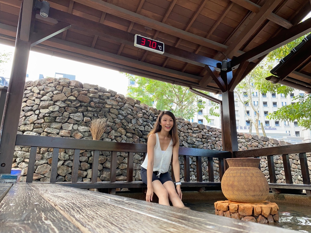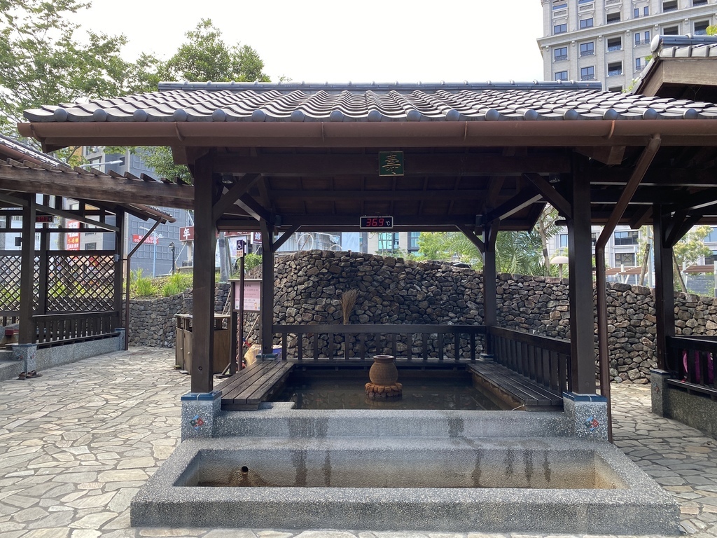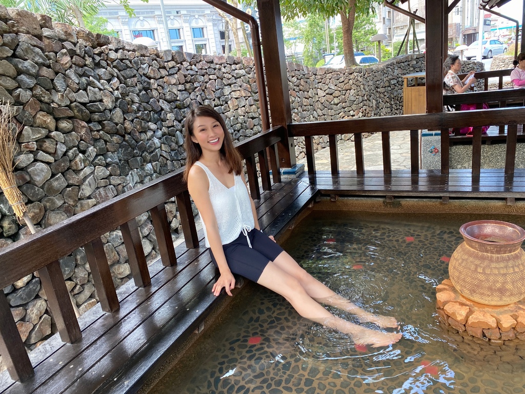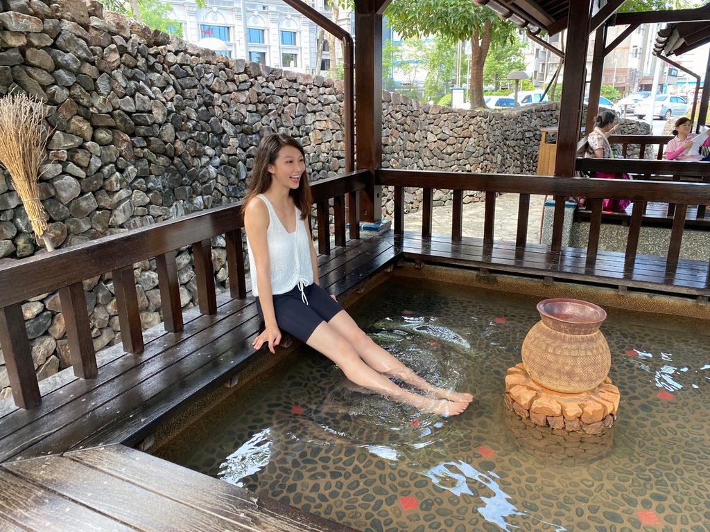 這樣方方正正的泡腳池設計實在很特別,可以坐在池子旁的板凳上歇息,因為有屋簷的設計,所以即便下雨也不擔心!