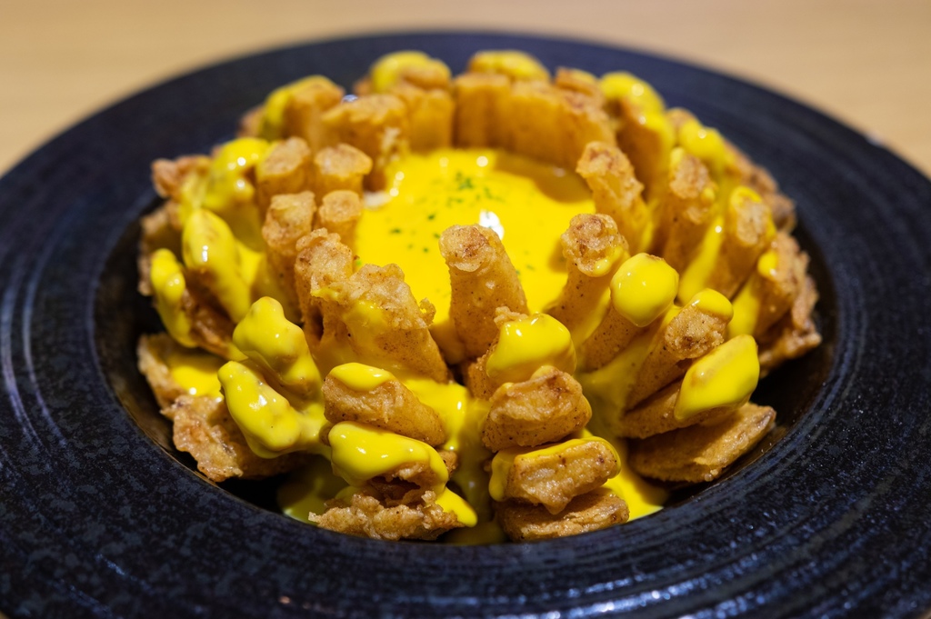 洋蔥炸成一朵花的樣子真的很驚豔!淋上滿滿的起司醬,真的是讓人食指大動!