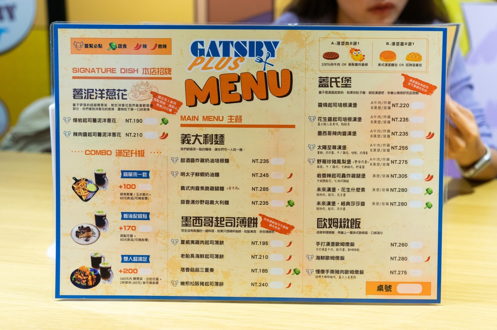 菜單上有店家招牌、主餐、墨西哥起司薄餅、蓋氏堡、歐姆燉飯,另也有加價的套餐選擇可以選購