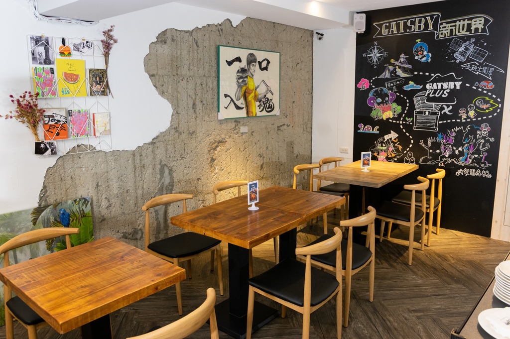 裡面的座位區有這樣四人及兩人的座位,整體的風格是工業+文青風,牆上的手繪黑板應景又可愛!