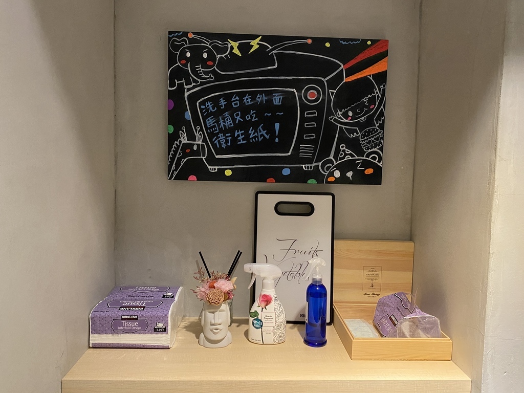 洗手間也有一個可愛的小摩埃,比較特別的是洗手台是設置在用餐區旁