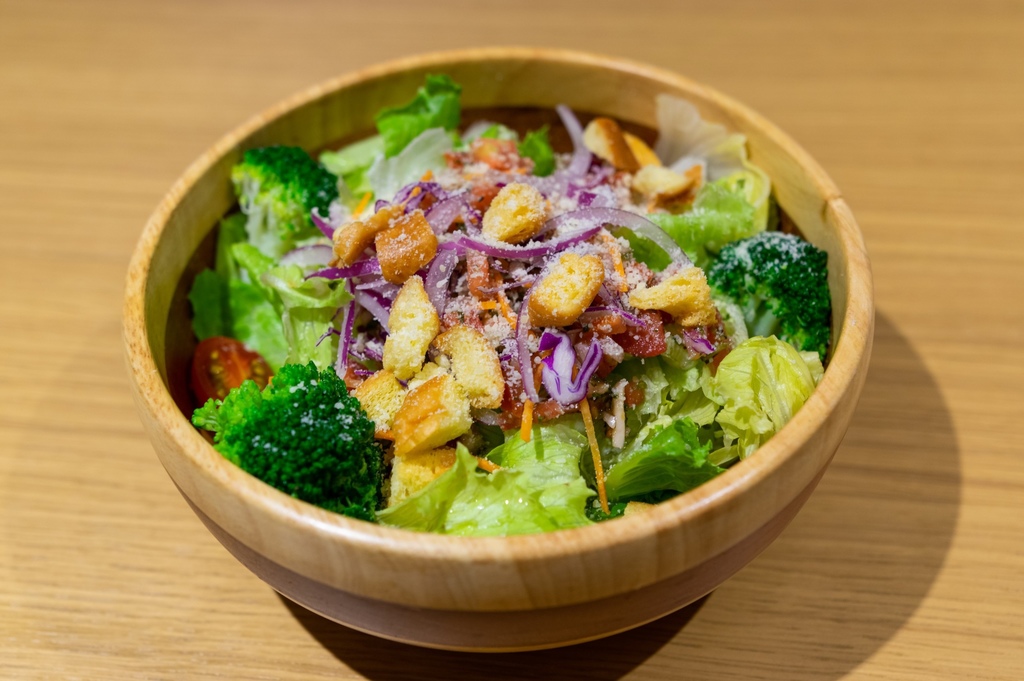 食材算是新鮮不雷,有花椰菜、美生菜、小番茄、紫甘藍絲、紅蘿蔔絲、麵包丁及撒上起司粉,使用木盆的容器,用餐也能有文青感呢!