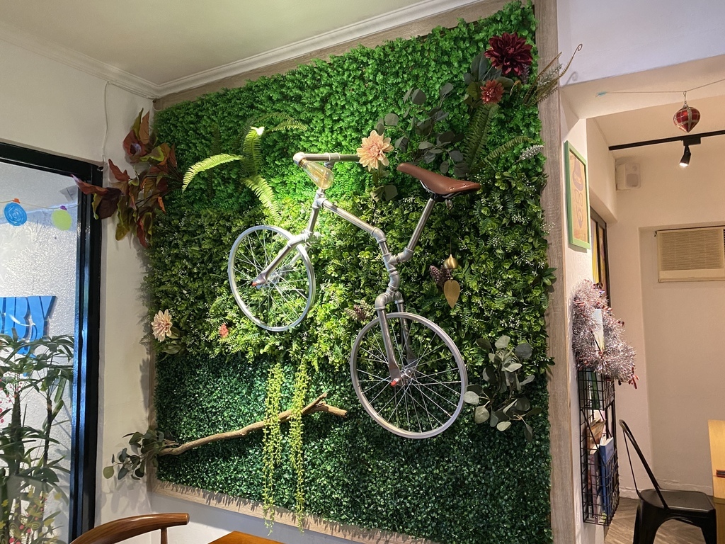 還有一面這樣的網美仿植栽牆,真令人好奇牆上的單車是怎麼固定的><