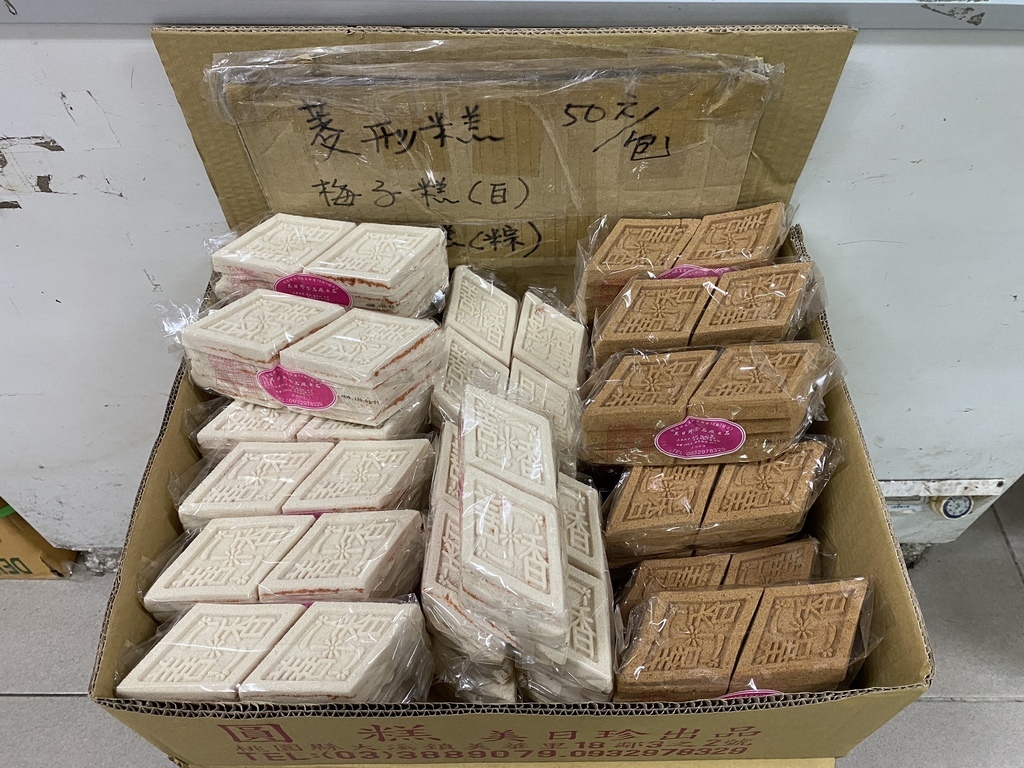 白色的梅子糕和咖啡色的綠豆糕一包是$50元,一包有六片