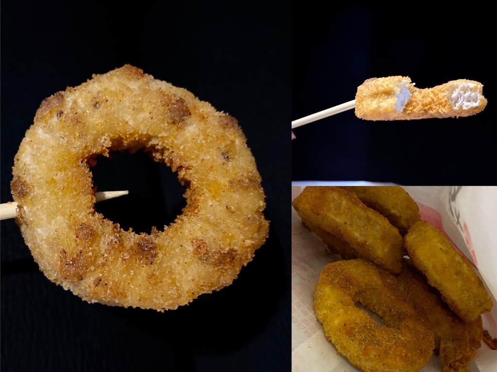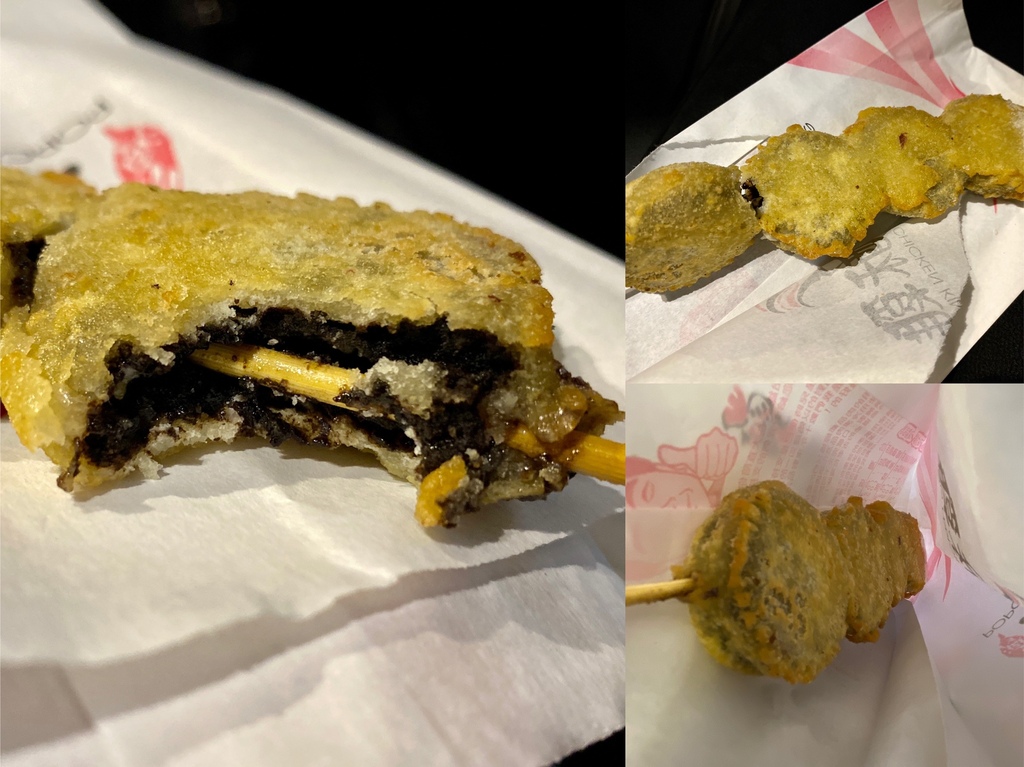 一串有四塊OREO餅乾,這是店家熱門的菜單選項之一,這也是全素的,素食者也能點來品嘗!知名餅乾裹上酥粉下去油炸,吃起來的口感和餅乾很不一樣,吃起來少了餅乾原先酥脆的口感,內層反而是鬆軟,竟讓人有種吃蛋糕的感覺!讓人十分驚喜!想要嘗鮮炸物美食的朋友也可以來點它喔~