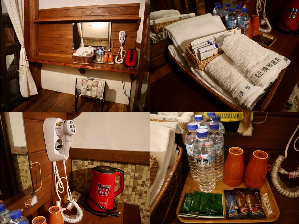 走進房內有這樣的隔間設計,這裡是梳妝台區,有大小毛巾及各式備品,另有壁掛吹風機、電熱水壺及免費的礦泉水、沖泡茶/咖啡包可以取用。