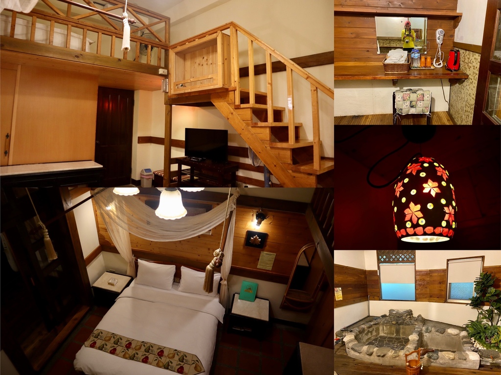 這次我安排入住的是105號房的VILLA庭園四人房,空間大小約為22坪,為挑高樓中樓房型,共兩張雙人床,設置有沙發客廳及檜木岩石湯屋(冷熱溫泉兩池)