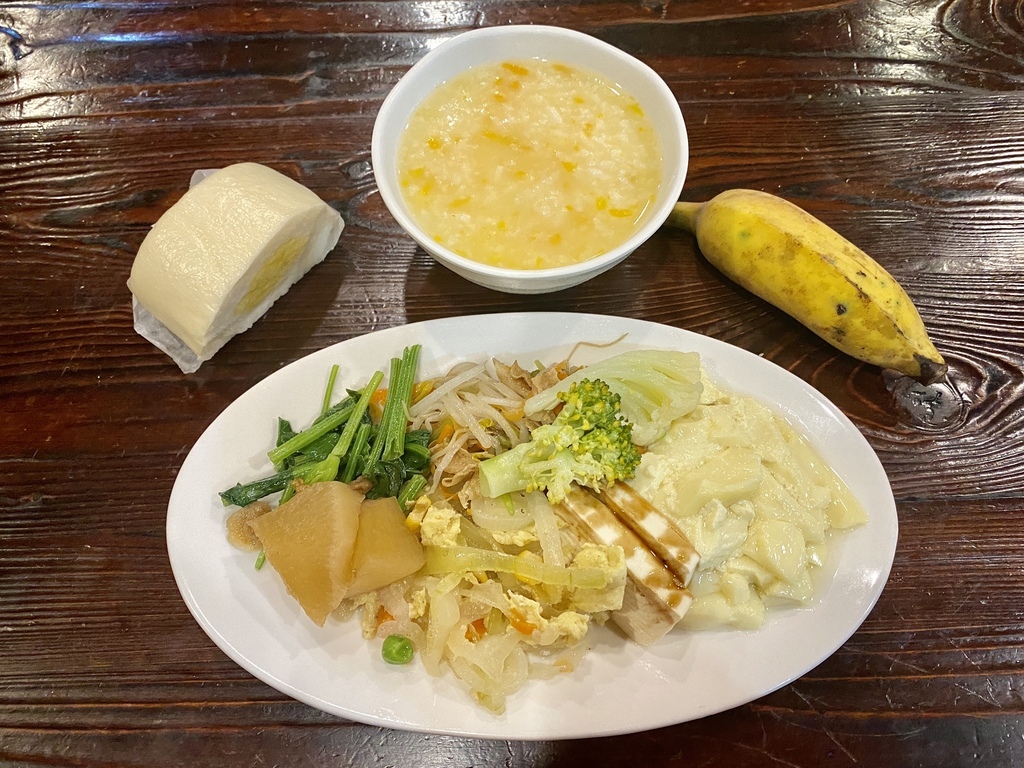 有南瓜粥、菠菜、豆皮炒豆芽菜、滷白紅蘿蔔、洋蔥炒蛋、白綠花椰、芭蕉及柳丁,另有清粥小菜的醬菜、蒸蛋、豆腐及銀絲卷