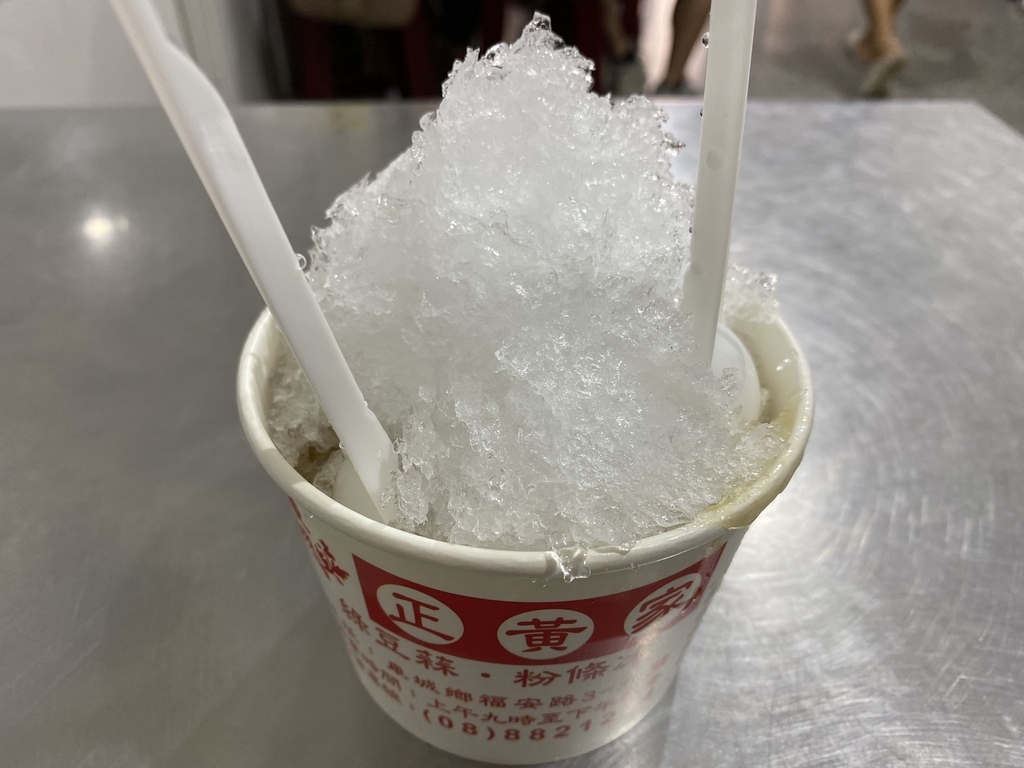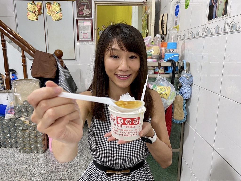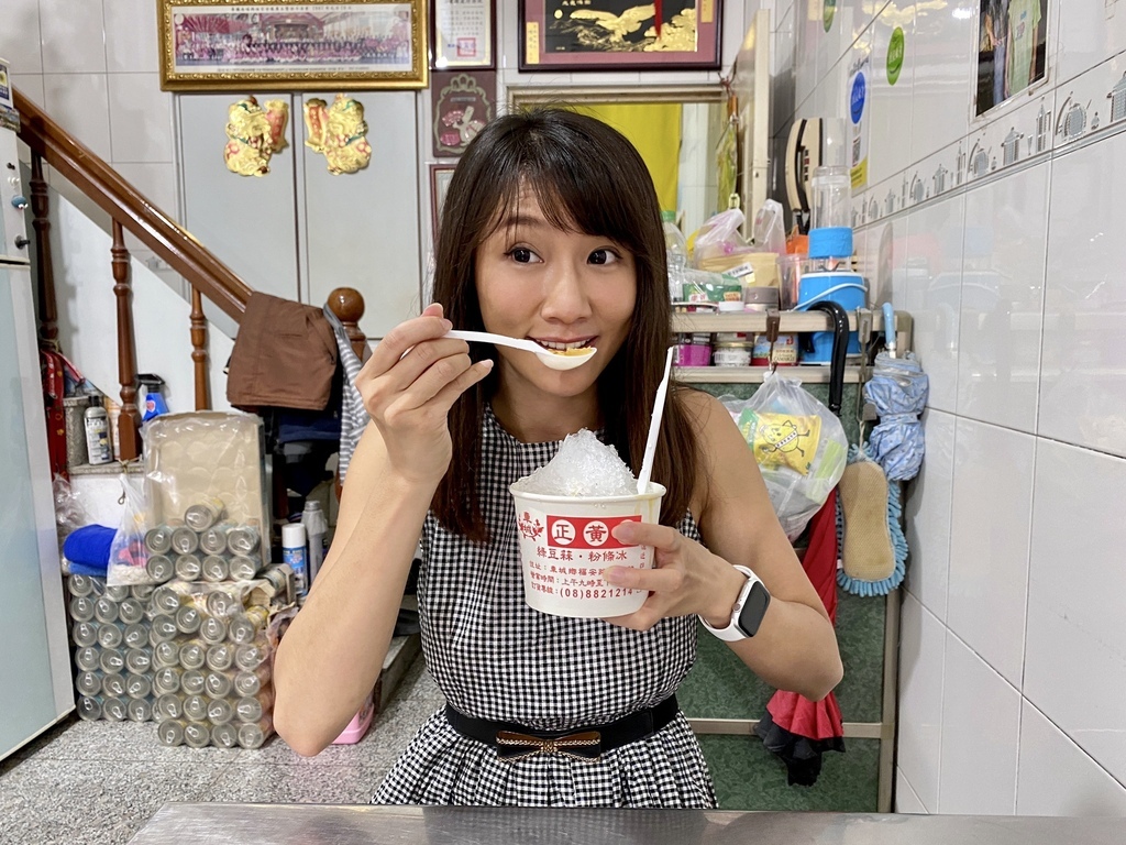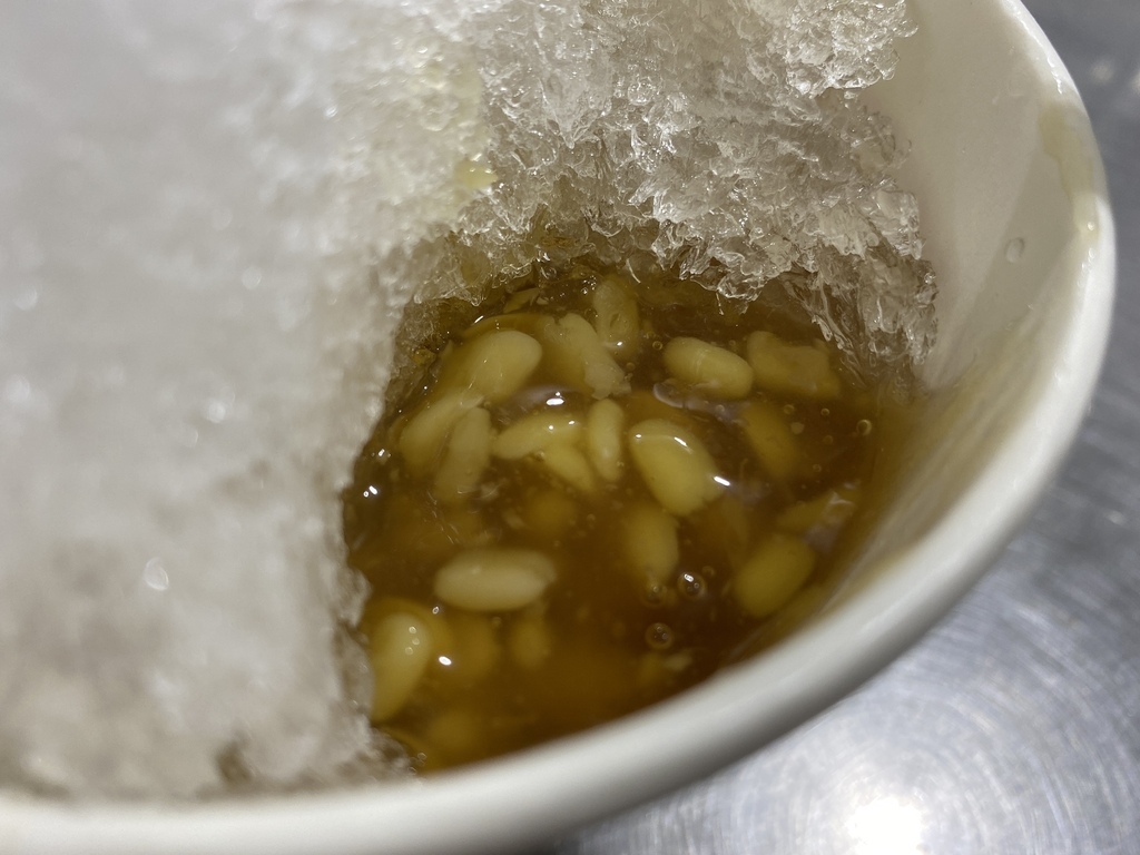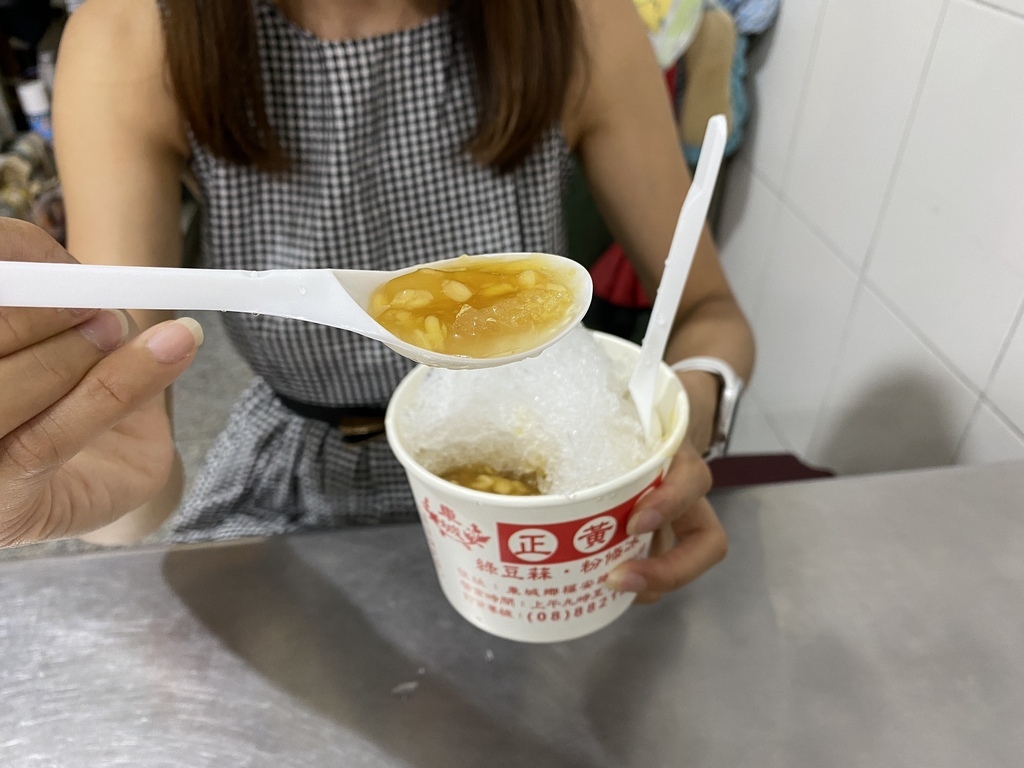 挖開刨冰後,可以看到裡面黃澄澄的綠豆蒜
