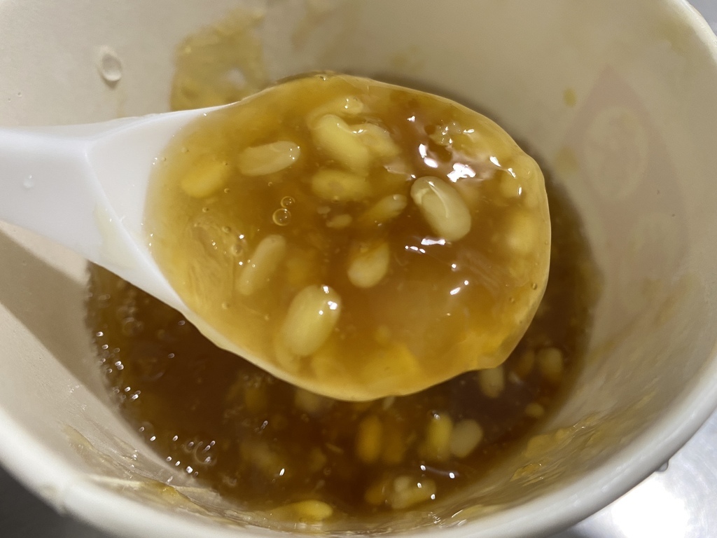 跟以往吃到的綠豆湯風味很不相同,綠豆蒜的綠豆仁吃起來很有口感,不若綠豆湯鬆軟的滋味,和著勾芡的糖水一起攪拌,每一口都盡是滿足!