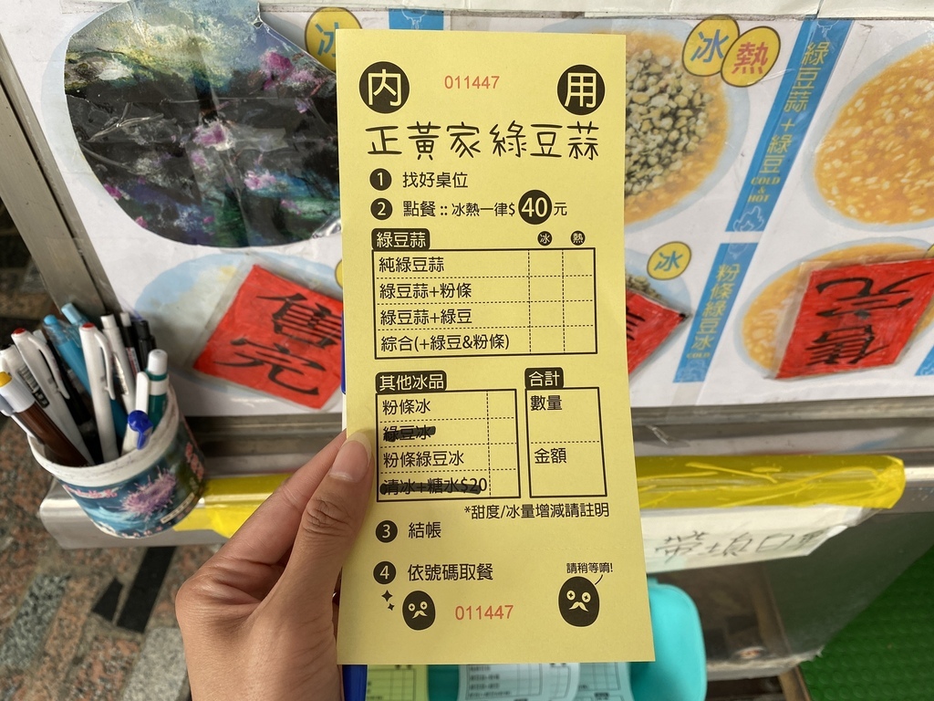 而這家正黃家綠豆蒜有分內用或是外帶的菜單,不論冰熱的價錢皆為$40元,綠豆蒜部分有純綠豆蒜、綠豆蒜+粉條、綠豆蒜+綠豆、綜合+(綠豆&粉條)的選擇,另有販售冰品的選項,價位皆是一樣的!
