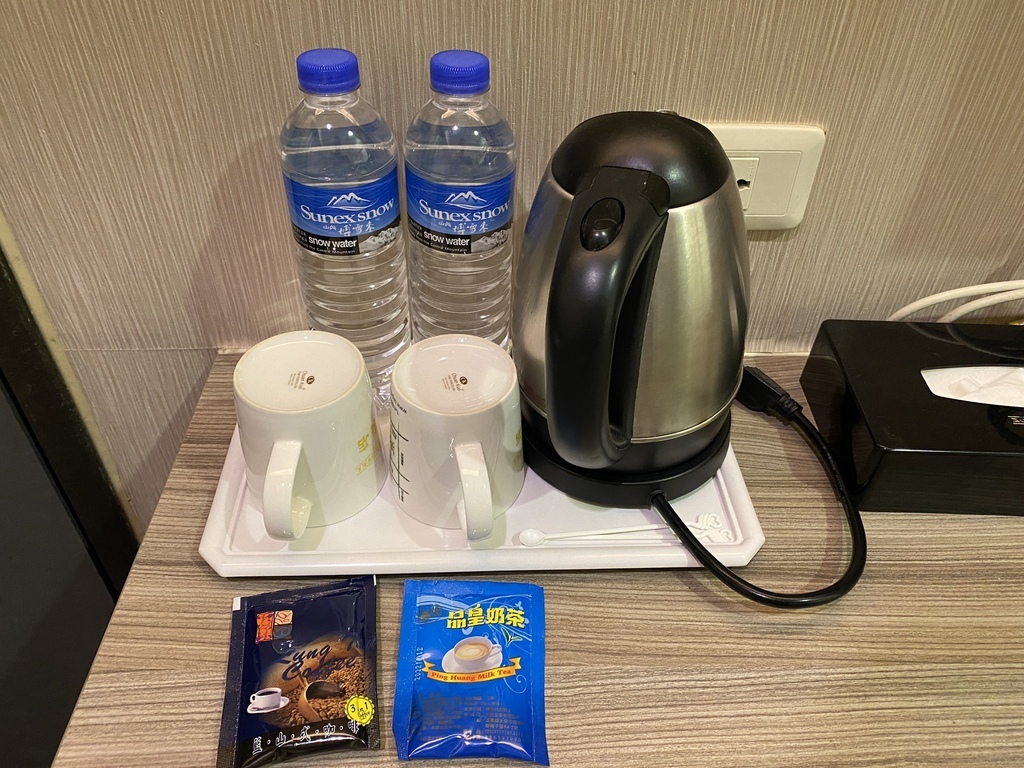 桌子上有電熱水壺、礦泉水、咖啡包及奶茶包