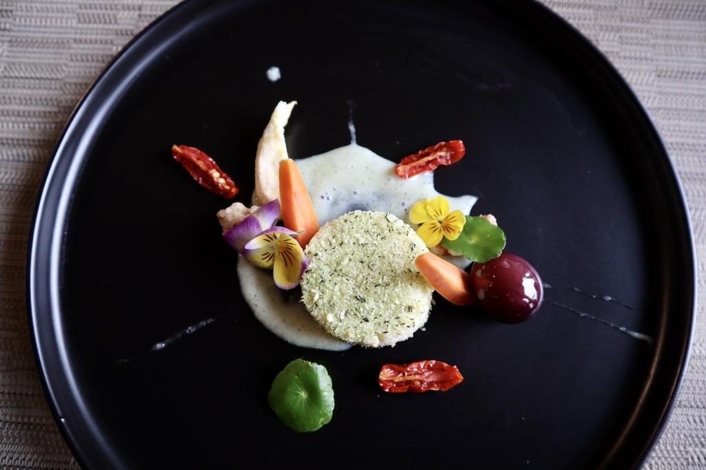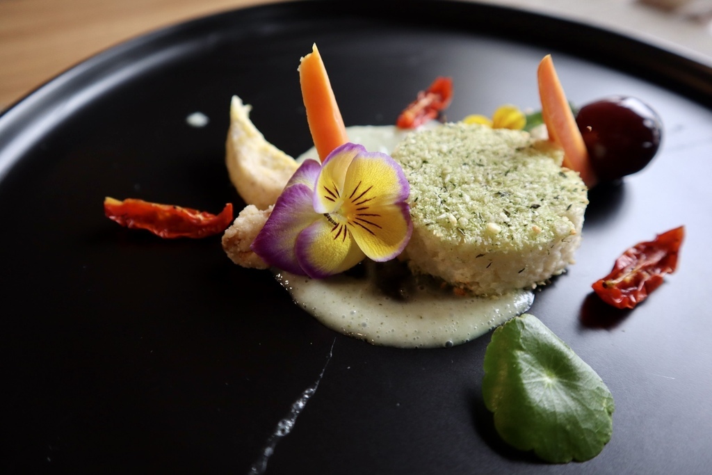 一旁紅色的是自然風乾番茄,還有葡萄及紅蘿蔔等擺飾,而中間圓形的是馬鈴薯製成的料理