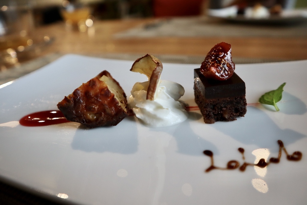 最後一道是甜點,迷你又精緻,甜點上方的風乾蘋果保留水果的香氣,讓人滿嘴芬芳,巧克力布朗尼上的醃製番茄扮演著去膩的靈魂,很有畫龍點睛的意味,不愧是主打私廚的餐廳呀!