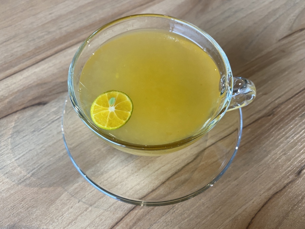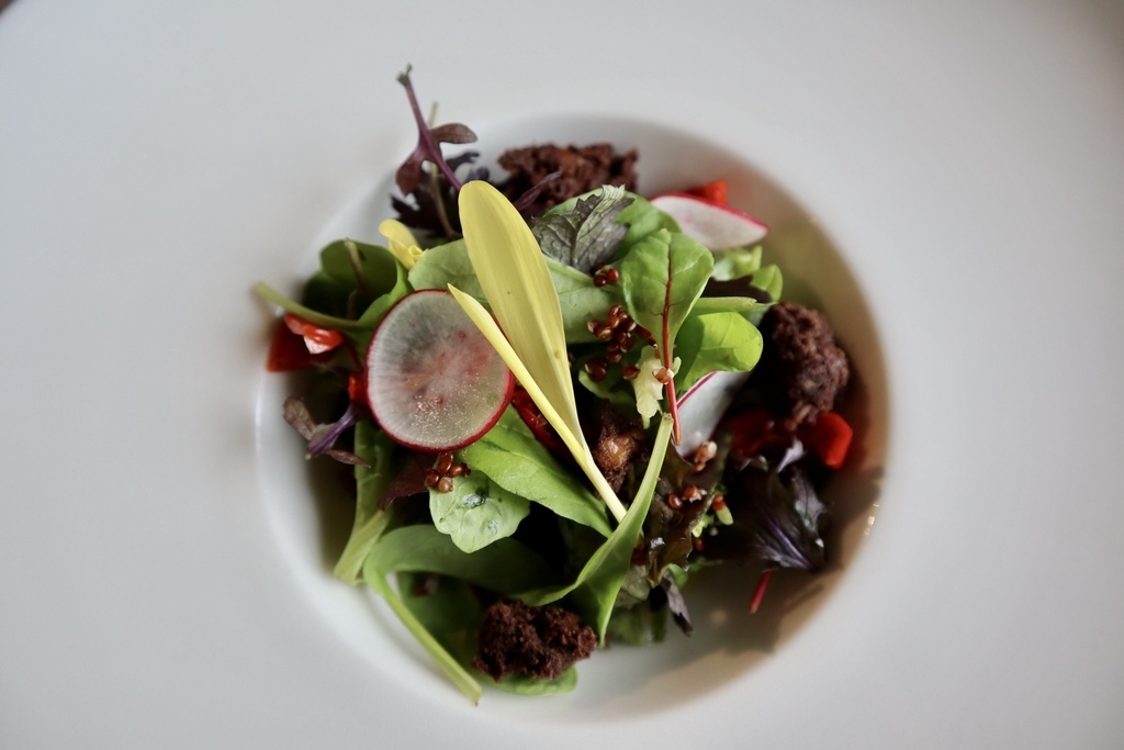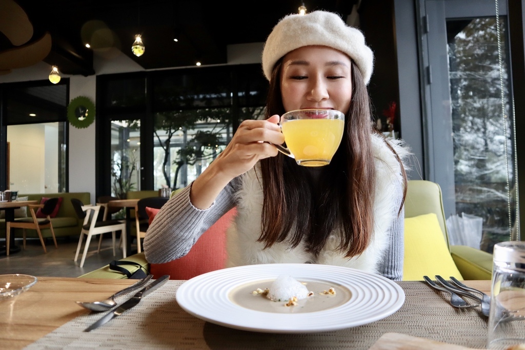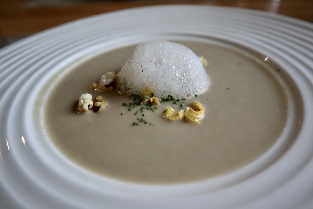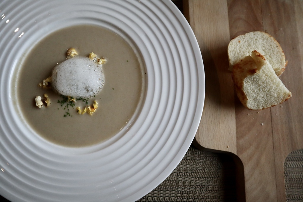 湯品是蘑菇濃湯,特別的是濃湯上面還有爆米花,一口濃湯一口爆米花,搭配起來有股特殊的米香,品嘗起來很有層次感,讓我和友人都覺得很驚艷!