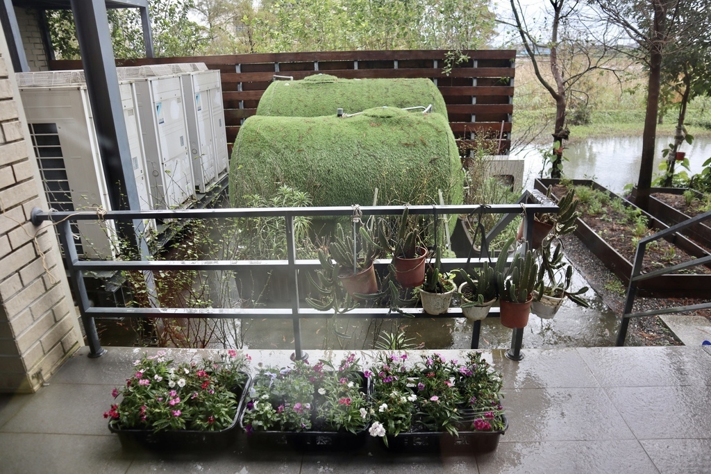 玻璃屋外也有許多的植栽,眼前的水塔很有趣,像穿上了綠色衣裳一般